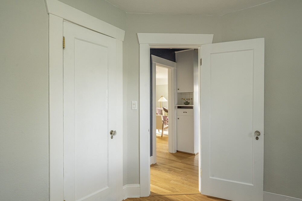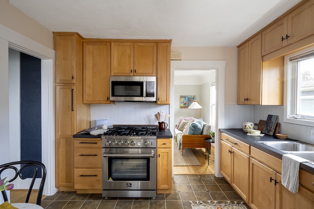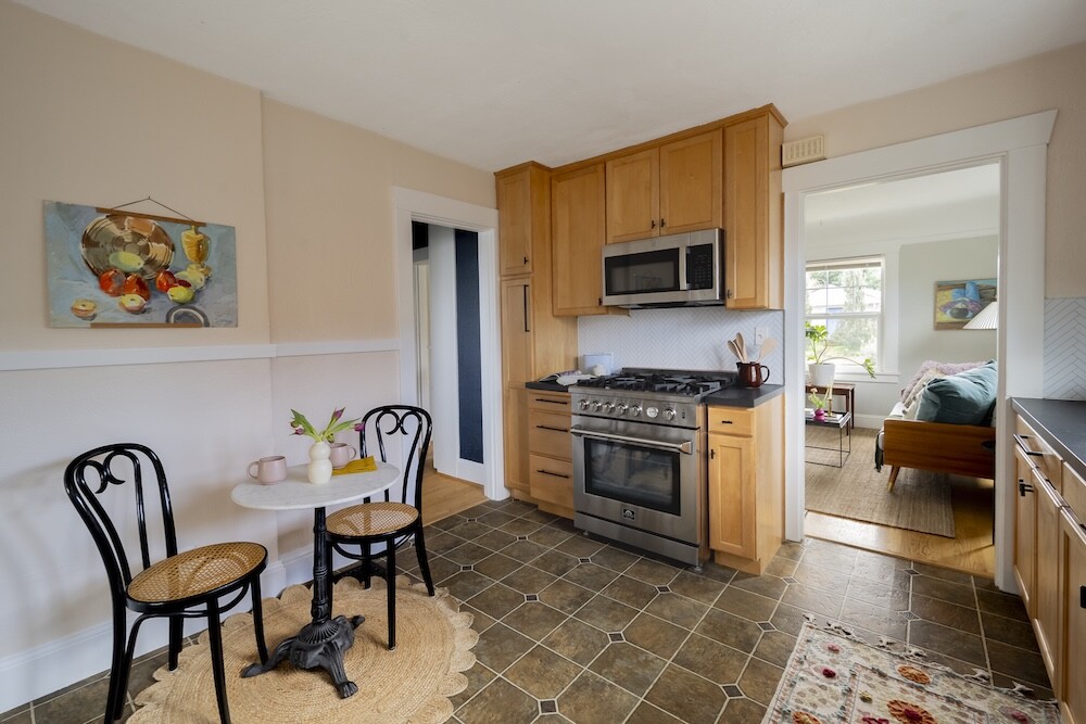 The roomy kitchen offers stainless steel appliances, and lots of valuable cabinet space. There’s vintage built-ins and hidden nooks that provide welcome pockets of storage throughout.