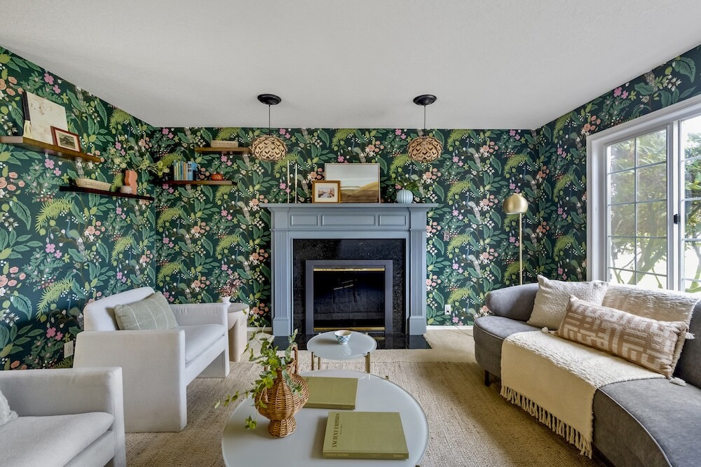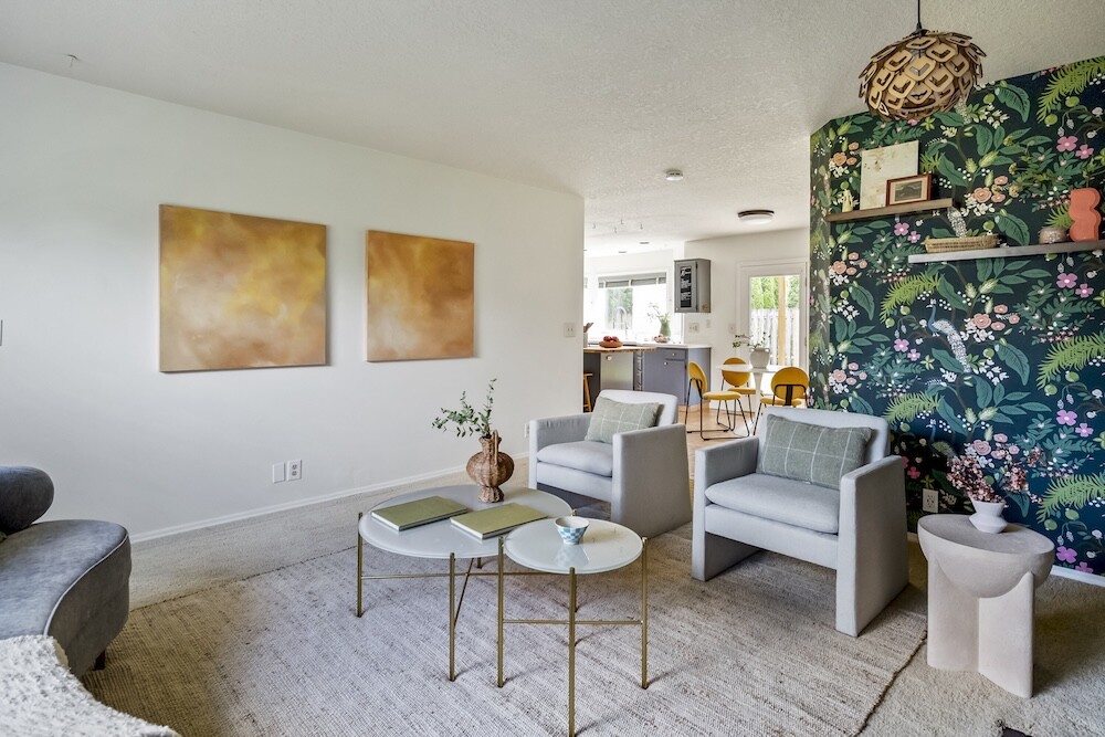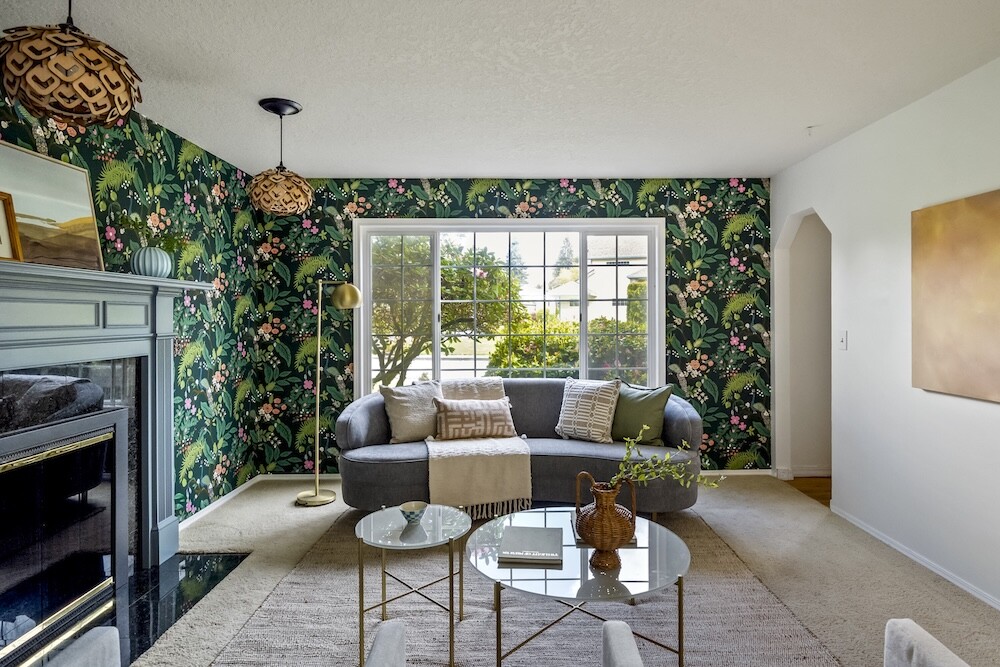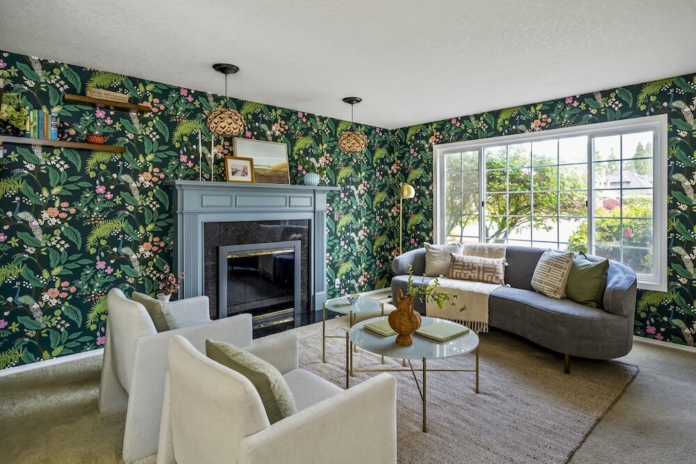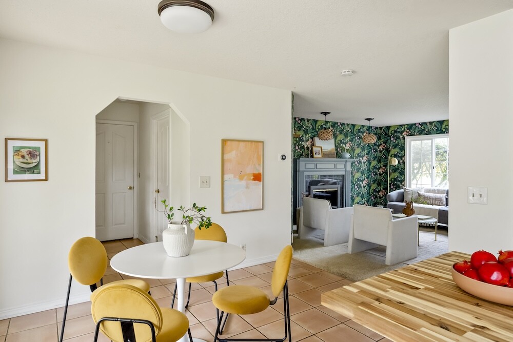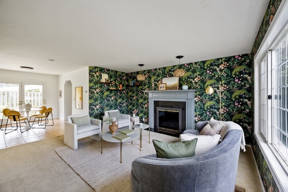 Enter the foyer to the living room, a sun-dappled retreat for relaxing with a book. A wood-burning fireplace anchors the family room, made vibrant with modern wallpaper to add a splash of style to your space.