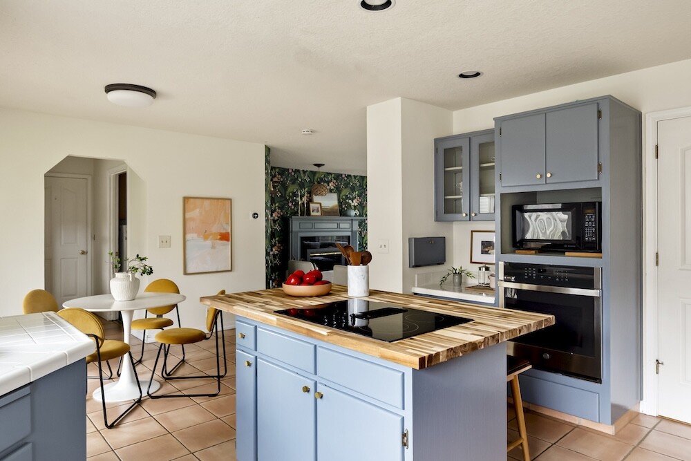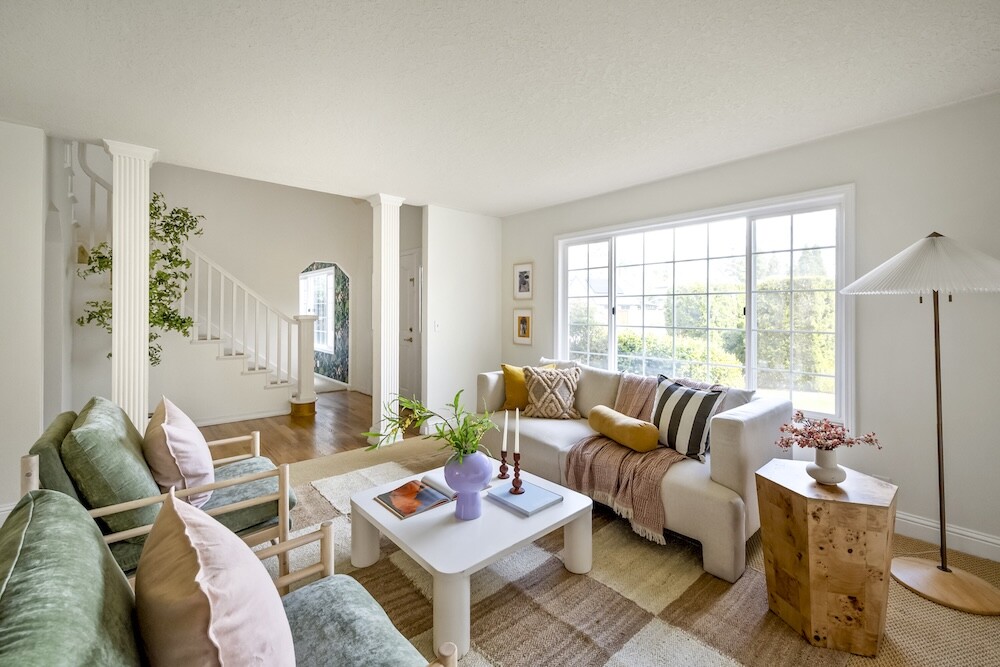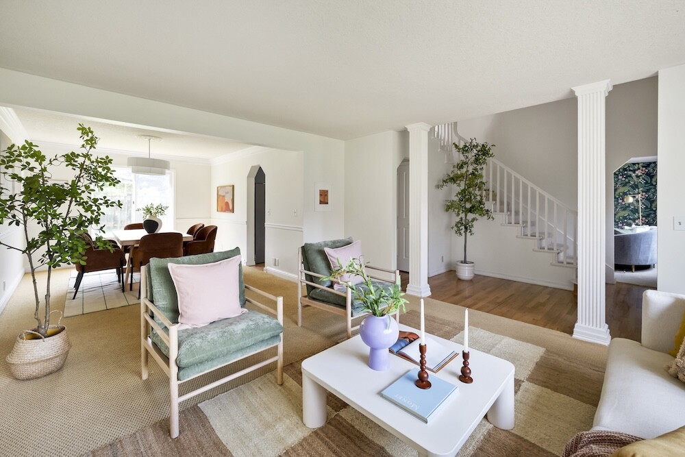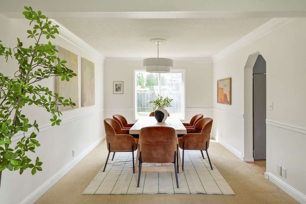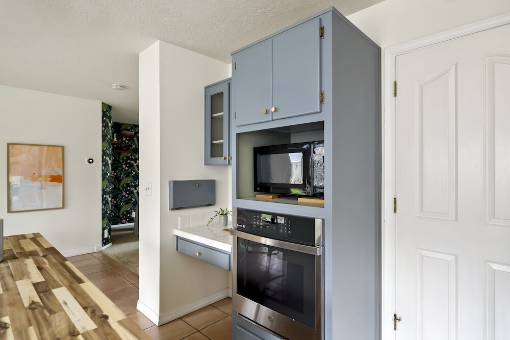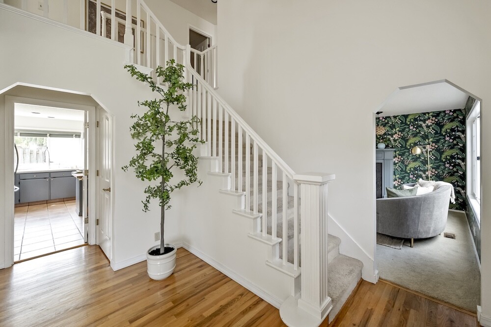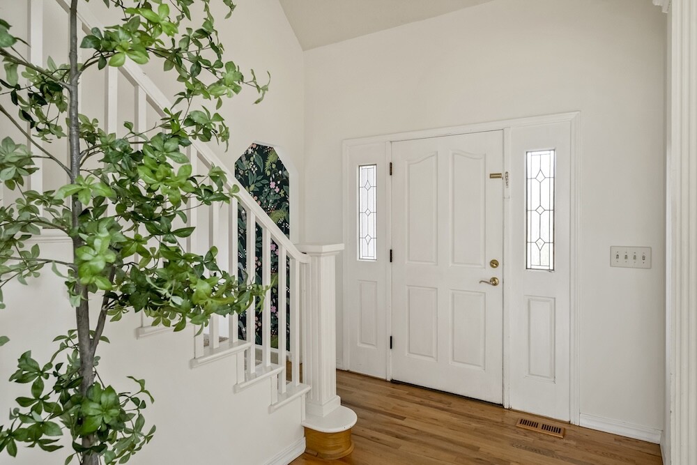 Enter the foyer to the living room, a sun-dappled retreat for relaxing with a book. A wood-burning fireplace anchors the family room, made vibrant with modern wallpaper to add a splash of style to your space.