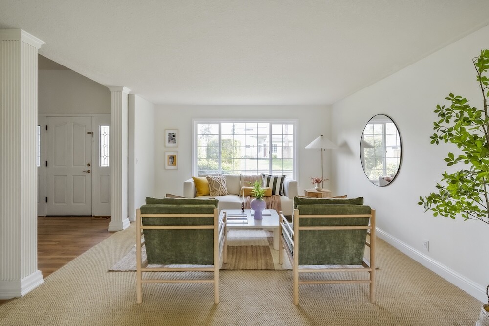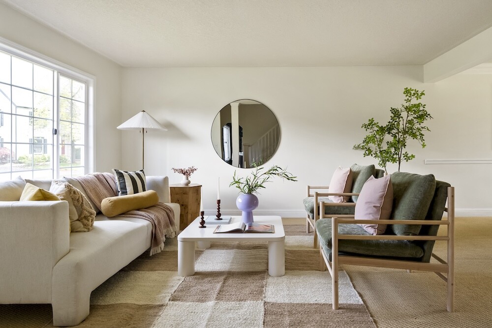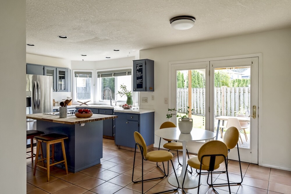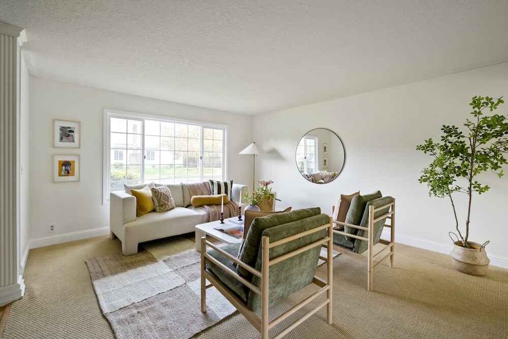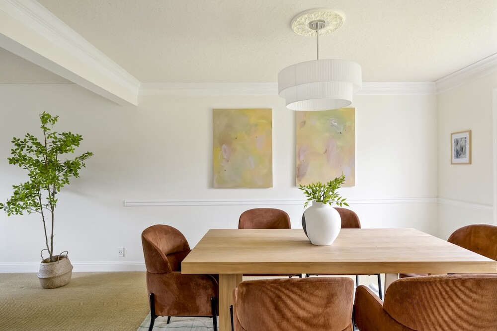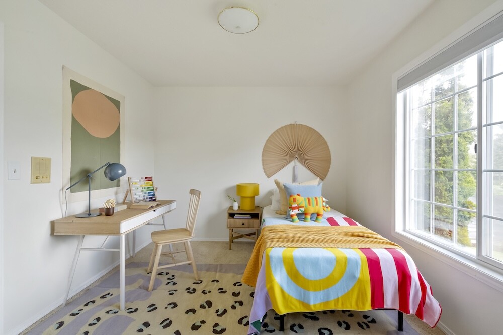 Enter the foyer to the living room, a sun-dappled retreat for relaxing with a book. A wood-burning fireplace anchors the family room, made vibrant with modern wallpaper to add a splash of style to your space.