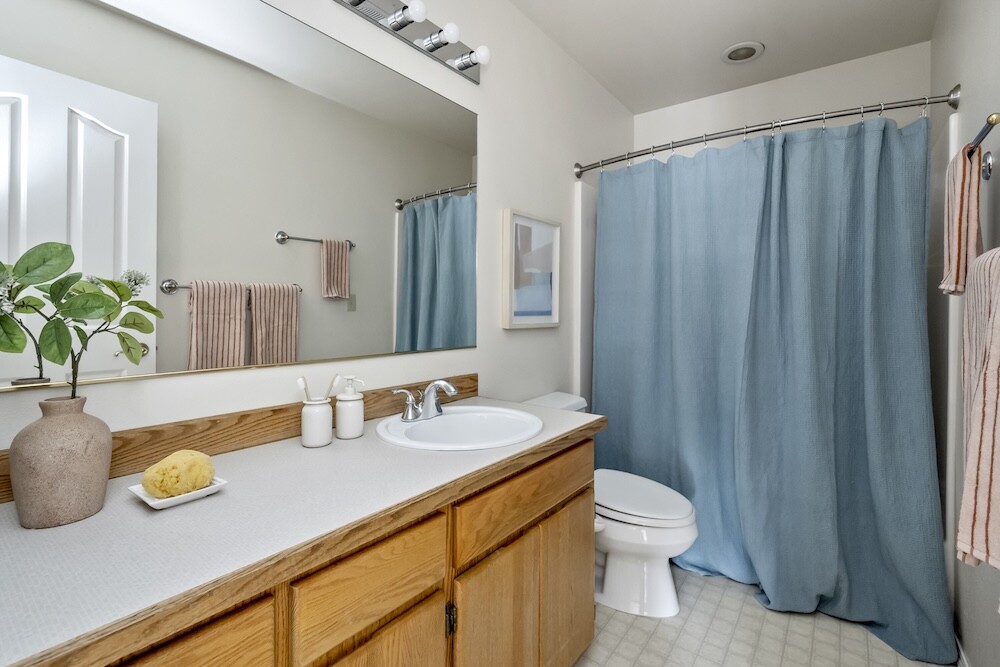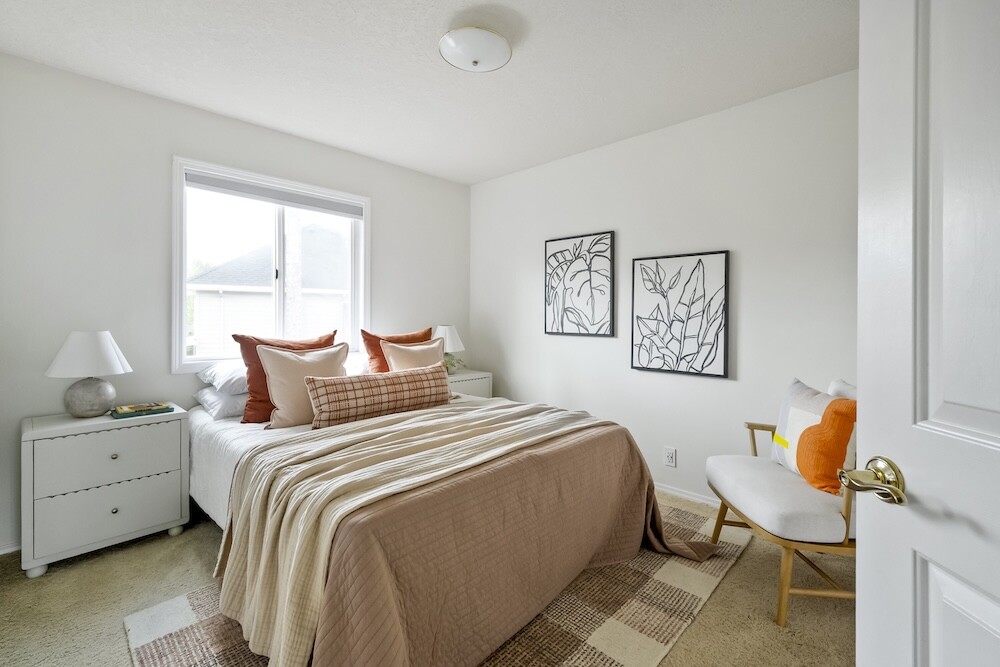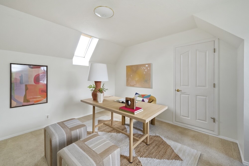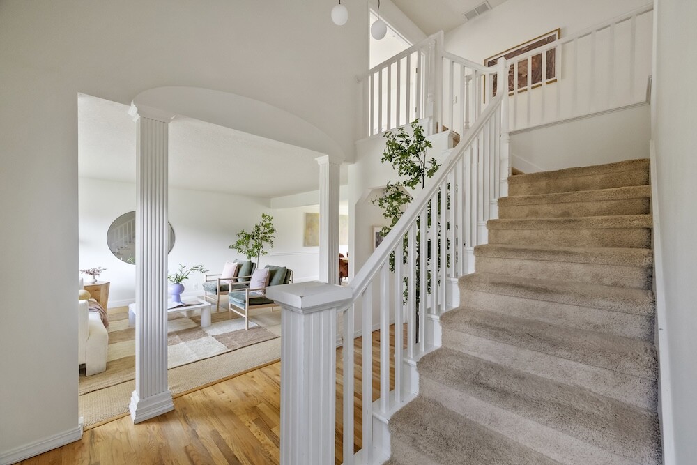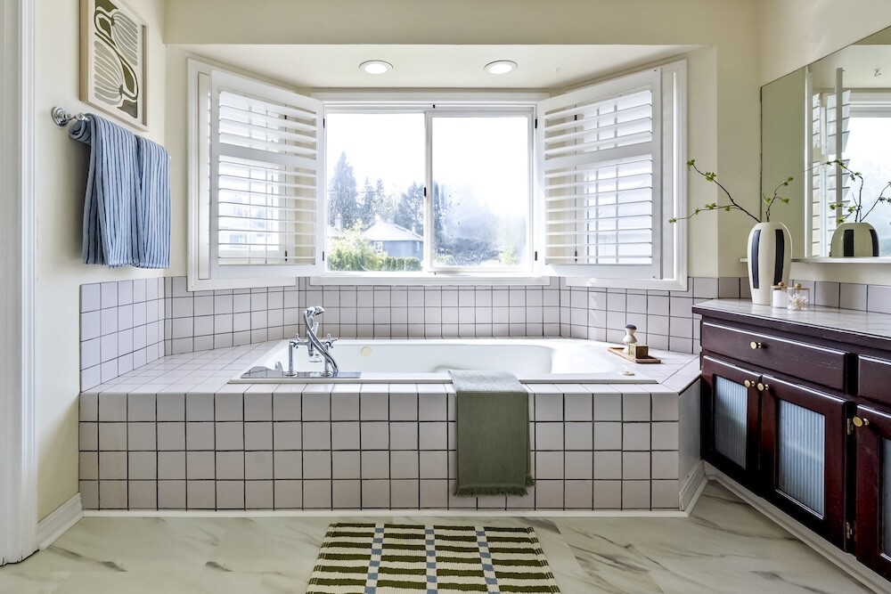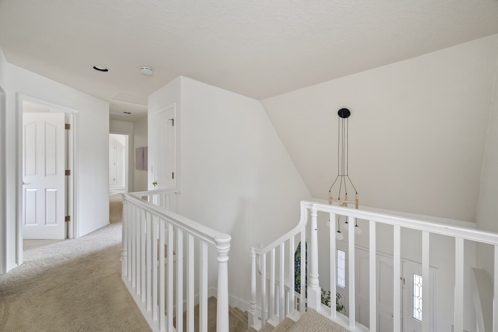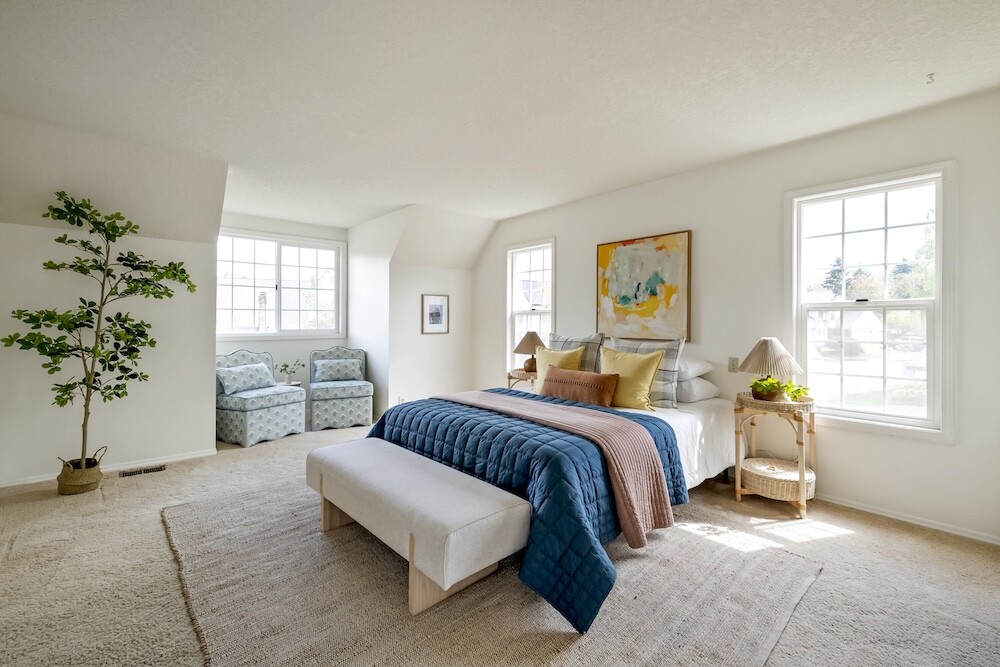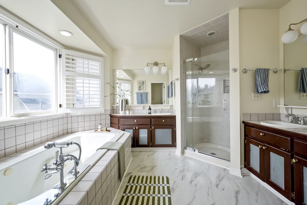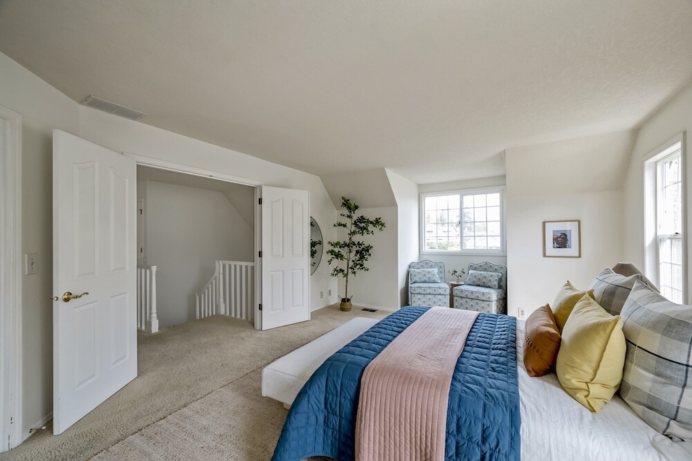 Upstairs, four gorgeous bedrooms with peaked ceilings and alcoves, and another full bath. The expansive primary bedroom has a walk-in closet, and a bathroom suite with a luxe jetted tub…yep, you’ve made it.